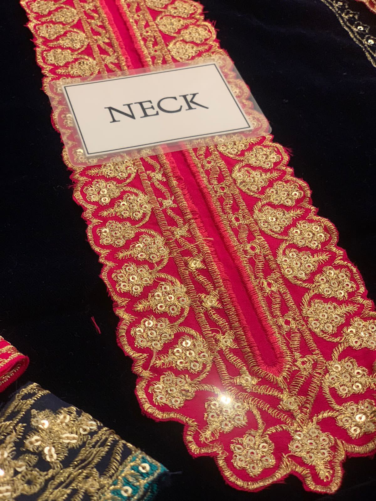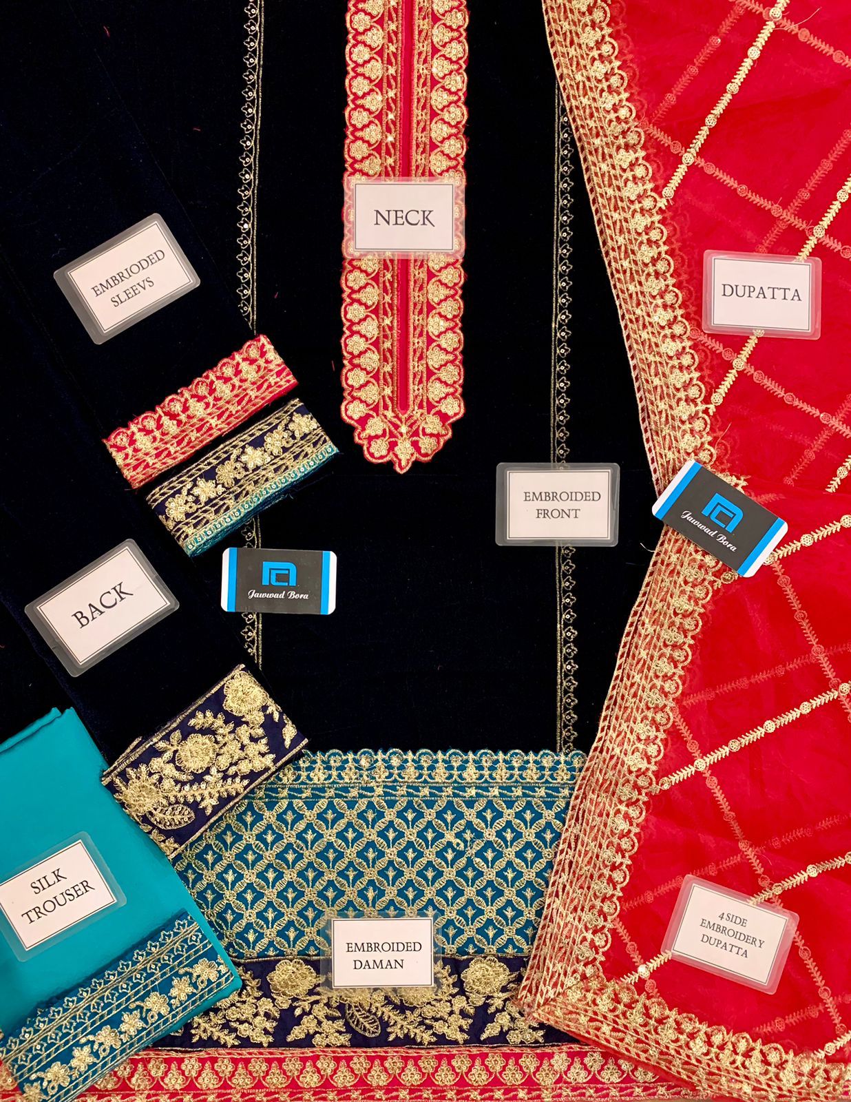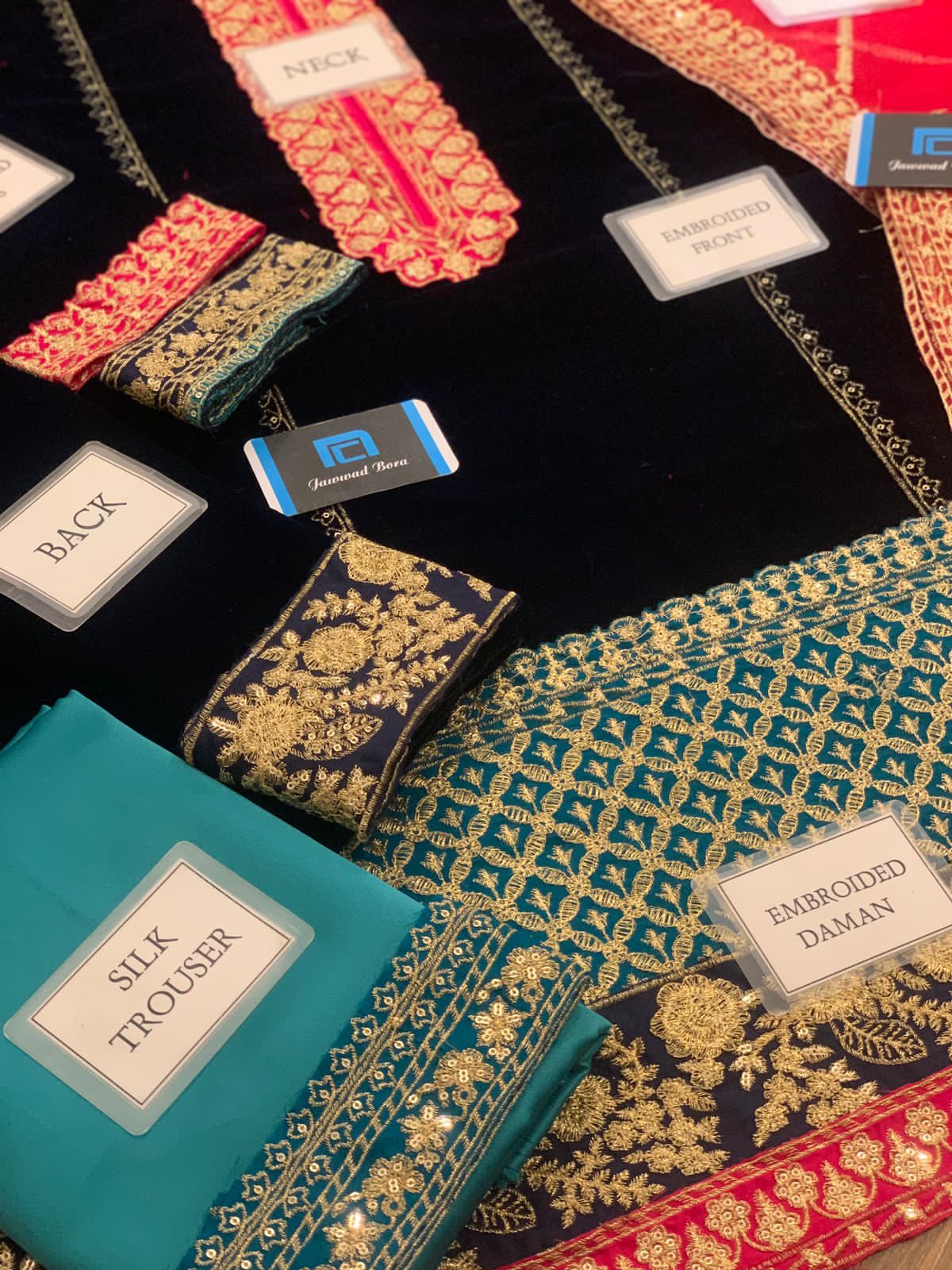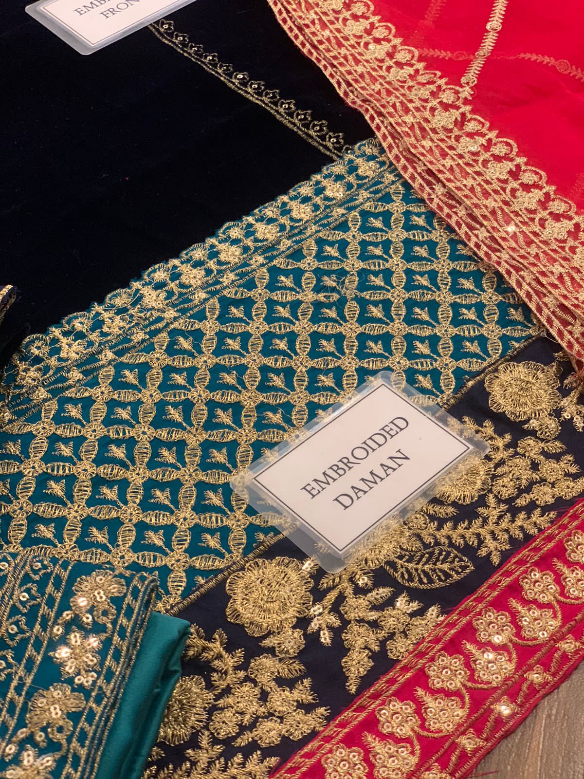 Front: Velvet embroidered spangle work with embroidered spangle work neckline and 3 types of heavy embroidered spangle work daman borders