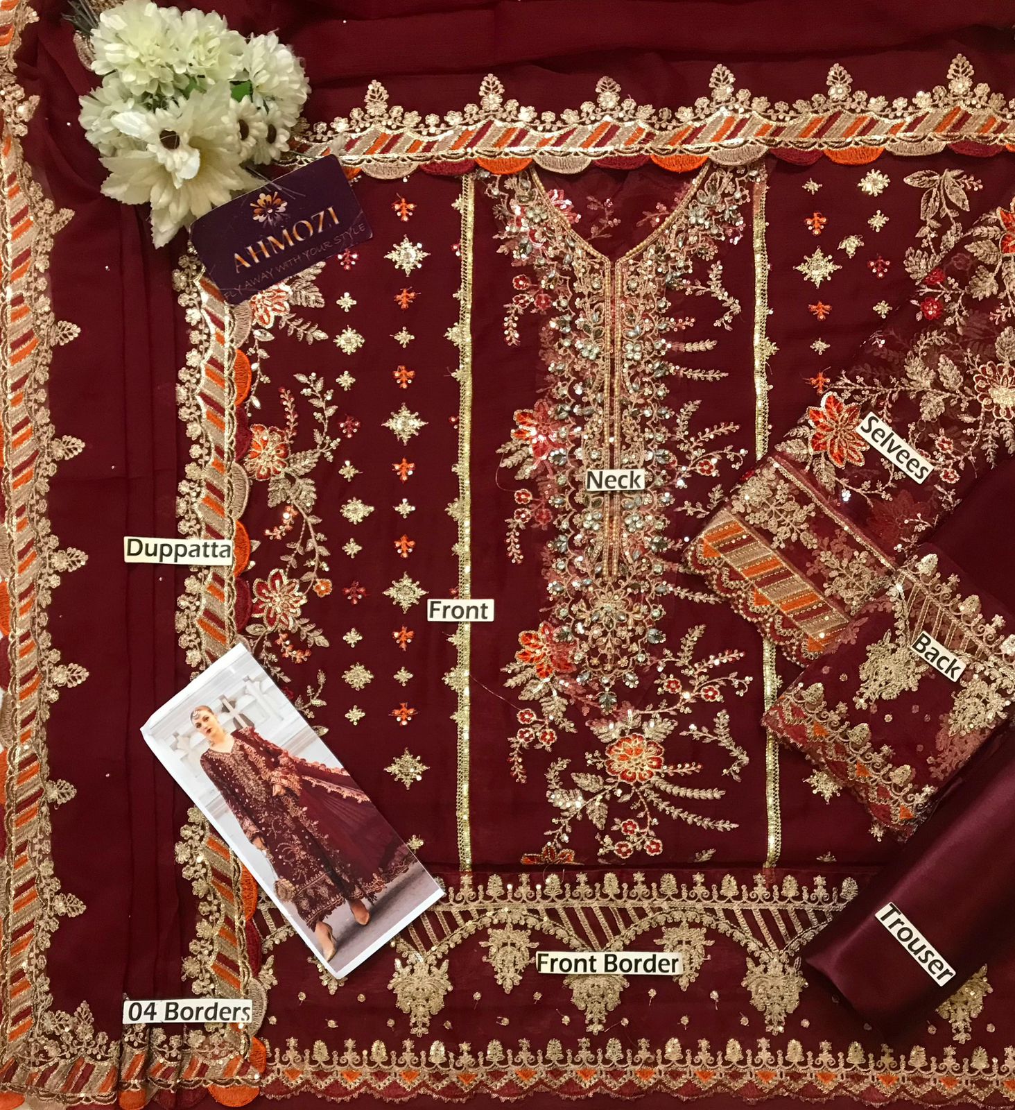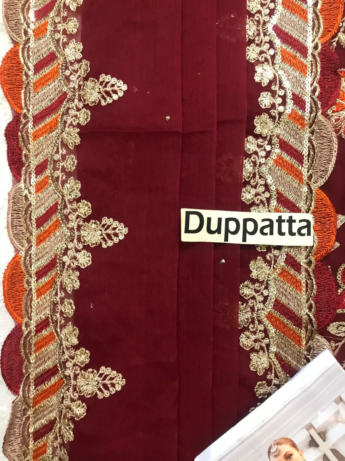 Heavy Embroidered Slevees Cuff Heavy Embroidery Chiffon Dupatta with 04 Side Heavy Embroidered Cut Work Borders