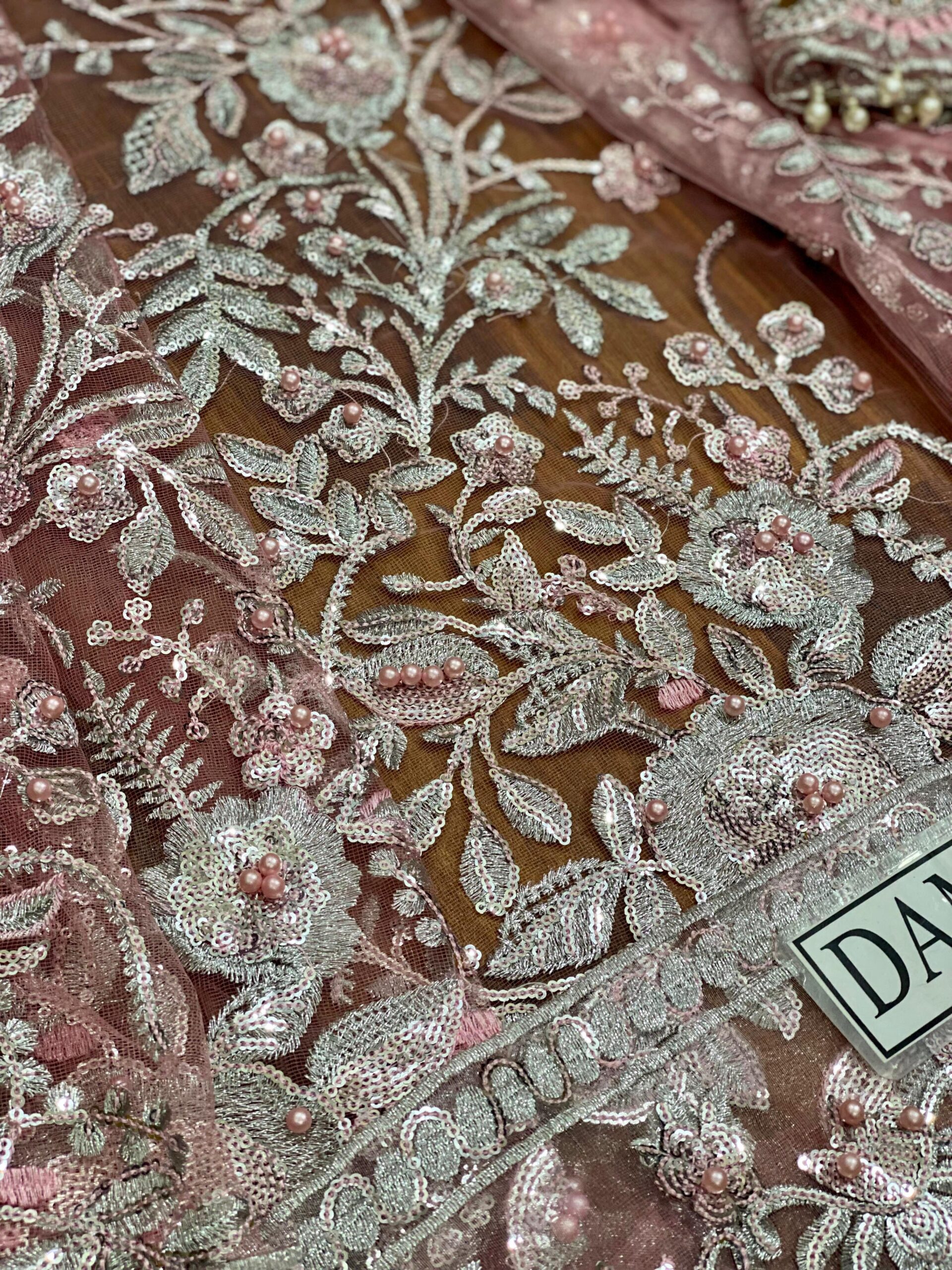 Front: Net with heavy embroidery, sequence, and pin punched work
