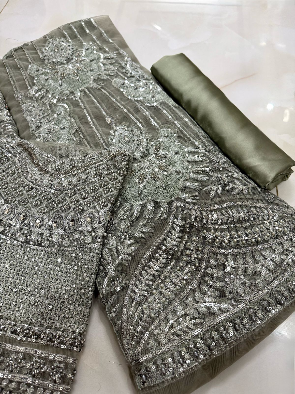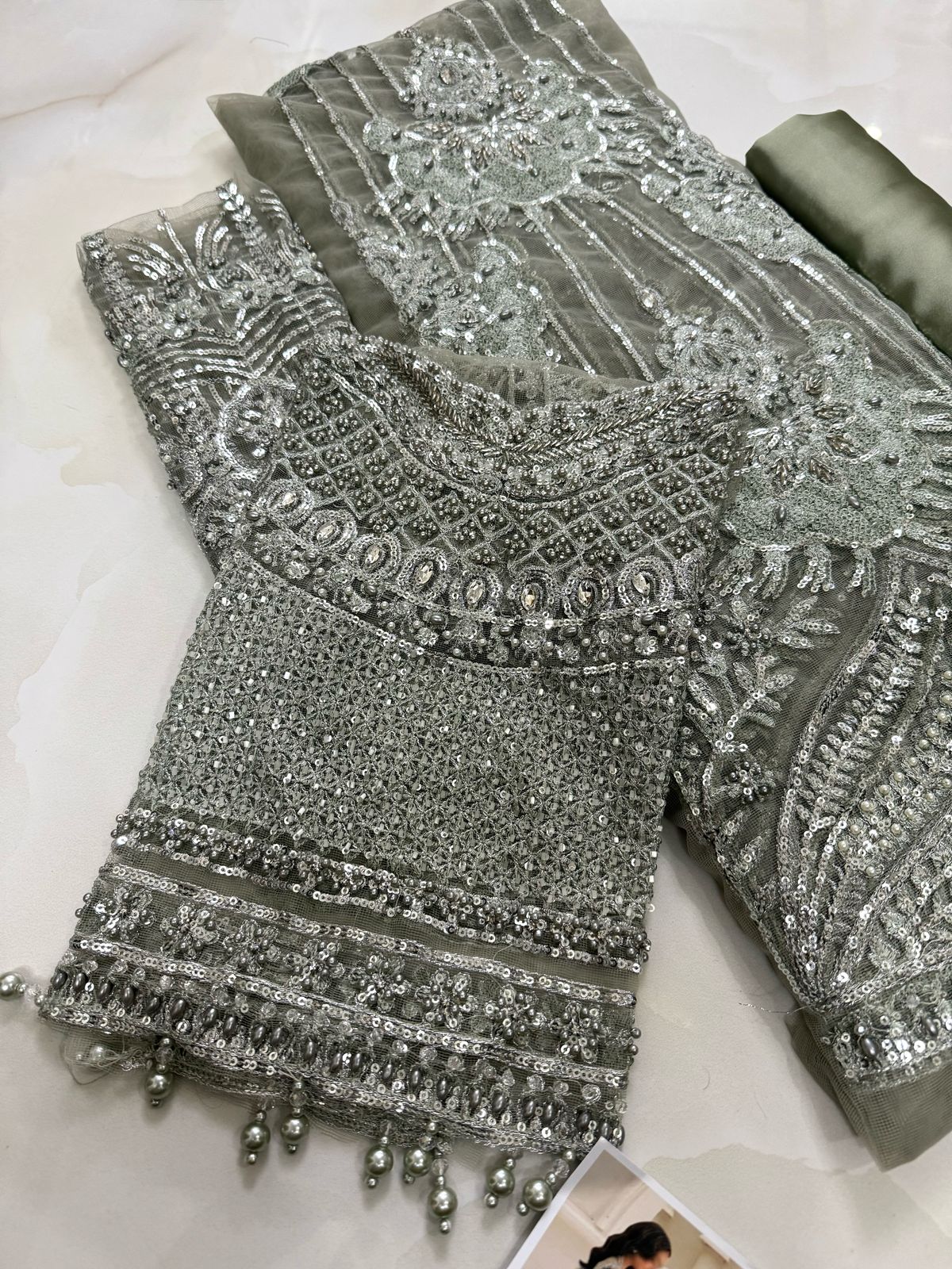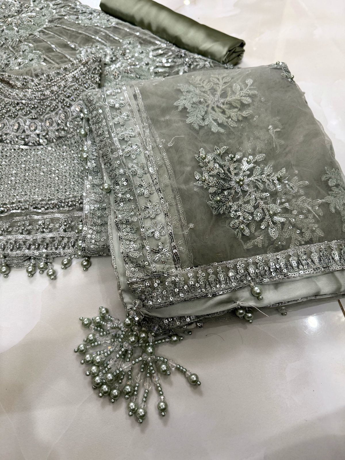 net fully heavy embroidered spengle work sarri gheera with heavy embroidered spengle work anchal with heavy embroidered spengle work pallou attachment with full hand work with 3d flower attach